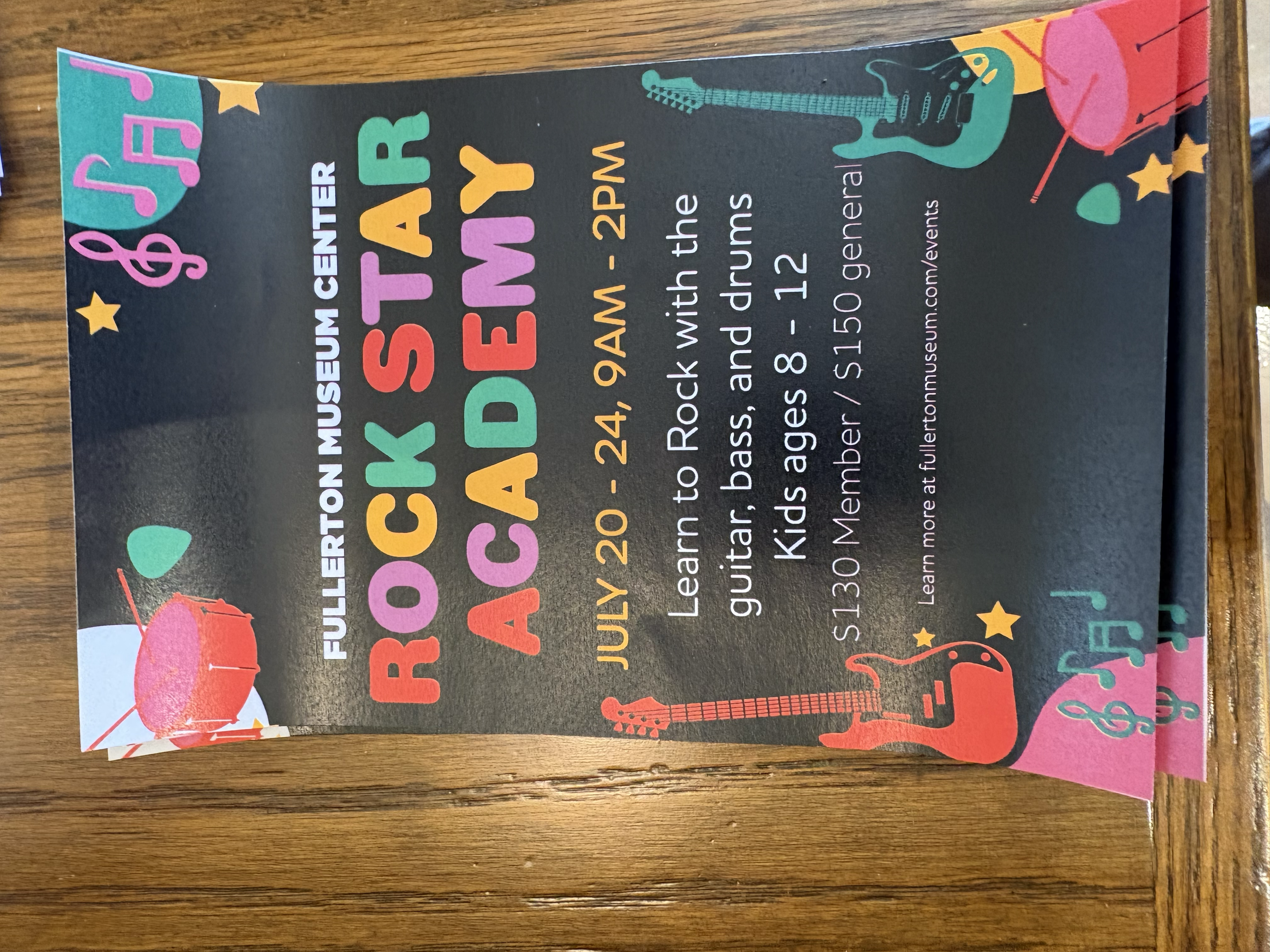 The Fullerton Museum Center's Rock Star Academy gives kids ages 8-12 a week-long deep dive into guitar, bass, and drums from July 20-24, 9 AM to 2 PM each day. A fun, hands-on music camp where young rockers learn from instructors and build real skills in a supportive environment. $130 for members, $150 general admission.