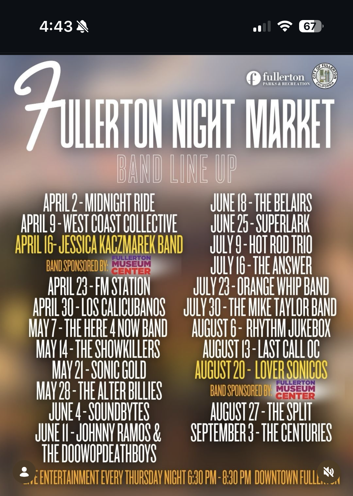 Fullerton Night Market runs every Thursday evening from April 2 through September 3, 2026 at Downtown Fullerton Plaza. Enjoy local vendors, food trucks, craft beer, live music (6:30-8:30 PM), and family-friendly fun from 4:30 to 8:30 PM. Free admission with a rotating lineup of live bands each week in the heart of Downtown Fullerton.