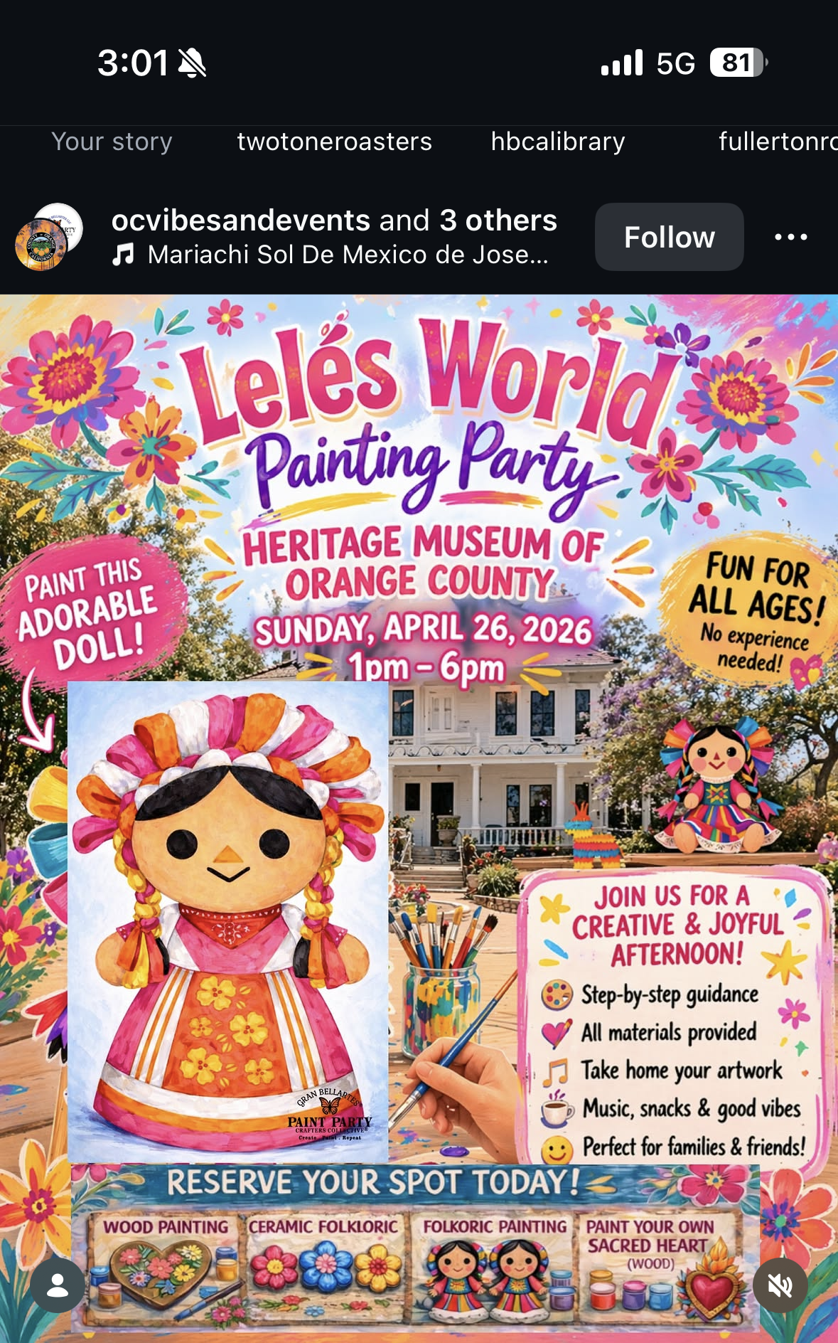 Lele's World Painting Party brings a creative and joyful afternoon to the Heritage Museum of Orange County in Santa Ana on Sunday, April 26 from 1 to 6 PM. Choose from wood painting, ceramic folkdoric painting, or paint your own sacred heart β all materials are provided and you take home your artwork. Step-by-step guidance is included along with music and snacks. Fun for all ages and perfect for families; no experience needed.