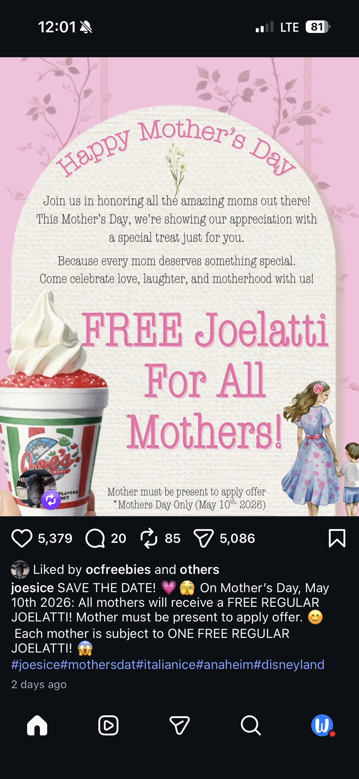 Celebrate Mother's Day at Joe's Italian Ice in Anaheim β all mothers receive a FREE regular Joelatti on May 10, 2026! Joe's is honoring the amazing moms of Orange County with a special treat near Disneyland. Mom must be present to redeem. Joe's Italian Ice is a Southern California institution, beloved for its authentic Philly-style Italian ice and soft serve ice cream.